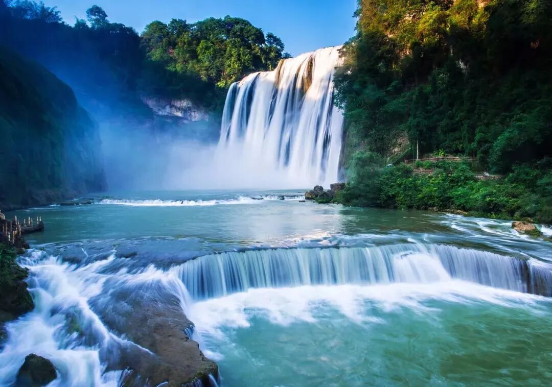黄果树大瀑布位于贵州安顺镇宁布依族苗族自治县境内白水河上,连环密布的瀑布群而闻名于海内外,享有“中华第一瀑”之盛誉,也是世界上最阔大壮观的瀑布之一。奔腾的白水河在这里从悬崖绝壁上直泻而下,形成九级瀑布,落差共为105.4米,漩涡无数,声如雷鸣,响达千米。水雾经阳光折射,五彩缤纷,变幻无穷,气象万千,风景极为壮观。