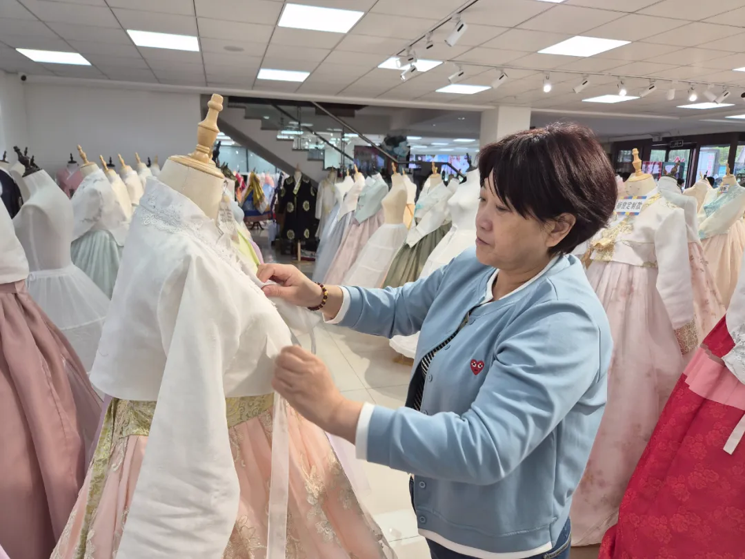 来自哈尔滨的刘女士正带着长辈和孩子在店内排队“变装”,这已经是她第二次来到延吉旅游。“之前是和朋友一起过来的,感觉延吉非常好玩,而且美食特别多,所以这次国庆假期带着家里的长辈和孩子,我们一行12口人,自驾游又选择了延吉。”刘女士说,老人和孩子穿上朝鲜族服饰都非常喜欢,在延吉度过了一个难忘的假期,全家人都非常开心,大家都很喜欢延吉这座城市,如果有机会还会再来延吉玩。
