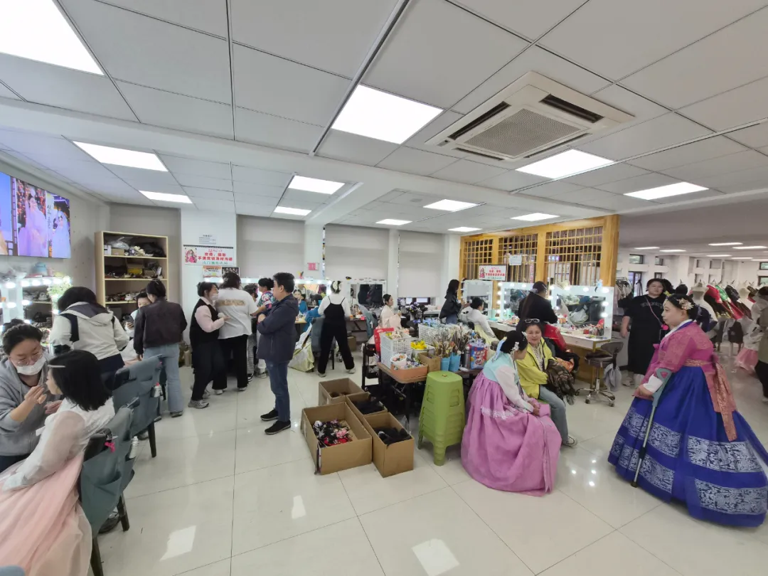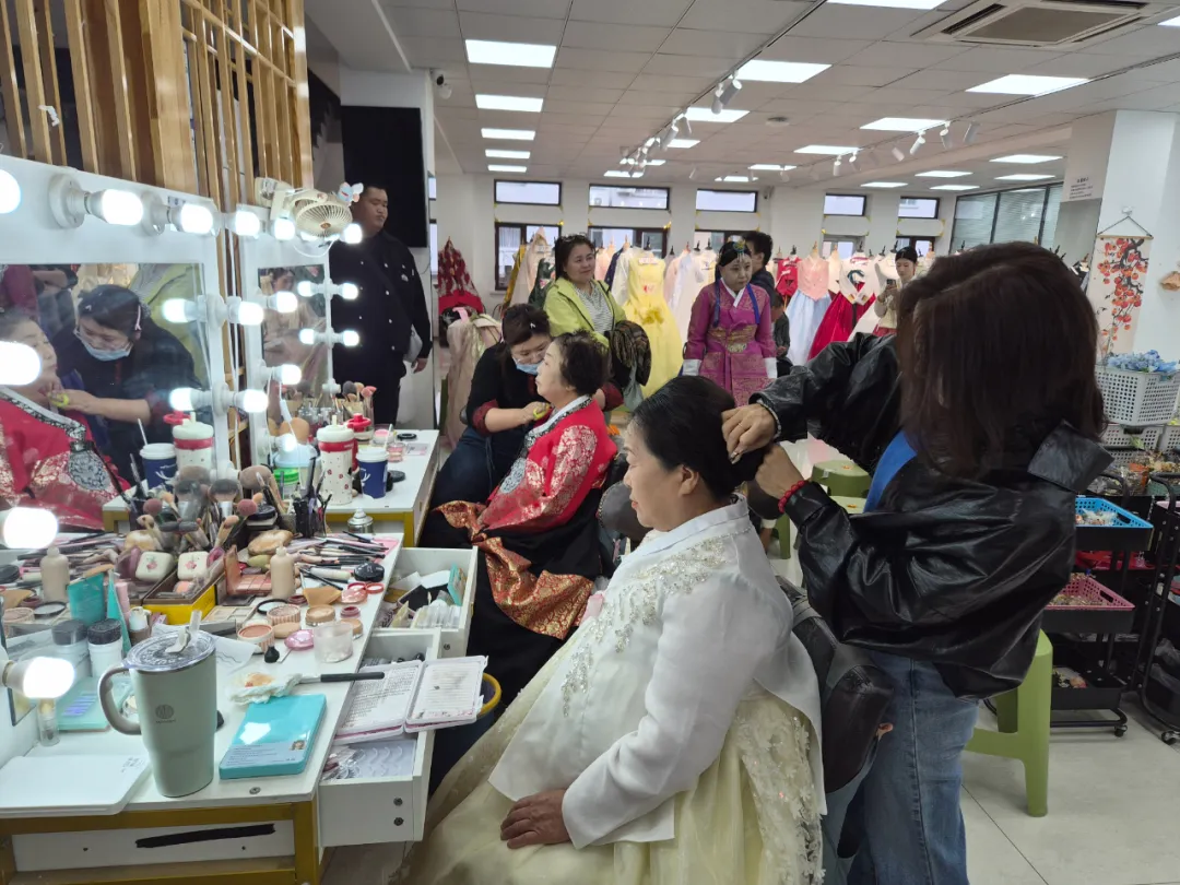 民俗园外的旅拍一条街上,各旅拍店早已灯火通明。记者随机走进美巷旅拍店内,化妆师、礼服师忙碌不停,挑选服饰、盘发造型、描画妆容......有的客人已经梳妆打扮完毕,准备前往民俗园开启美美的拍摄之旅,有的正在挑选心仪的朝鲜族服饰和妆造准备化妆,游客们在此体验“一站式”变身,成为一道独特的民俗文化“移动景观”。