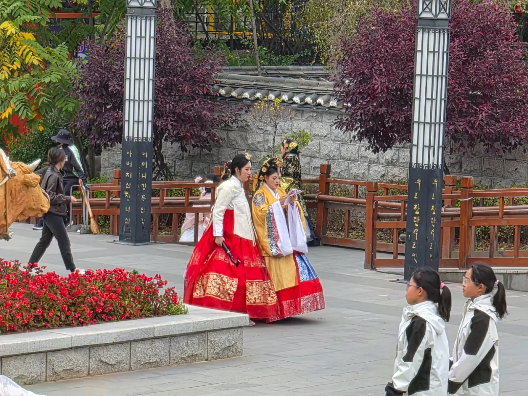 国庆假期,延吉中国朝鲜族民俗园迎来了客流高峰,成群结队身着精美朝鲜族服饰的“延吉公主”纷纷前来打卡拍照。