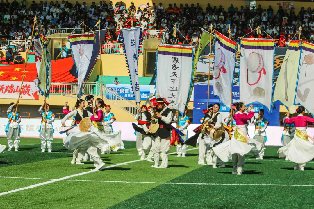 “延超”赛场成为展示民族文化的绚丽舞台。在比赛的开场和中场时间,朝鲜族象帽舞、长鼓舞等非遗表演与现代歌舞交相辉映,结合NPC互动演出、沉浸式情景剧等创新形式,进一步增强了观众的参与感和体验感。累计开展非遗舞蹈、快闪等特色文化展演超30场,参演人数超1800余人。安图主场的“奇妙的惊喜”玩偶秀、龙井市的“龙鼓舞”等,都成为赛事亮点,夯实了延边“足球之乡”“歌舞之乡”的双品牌定位。