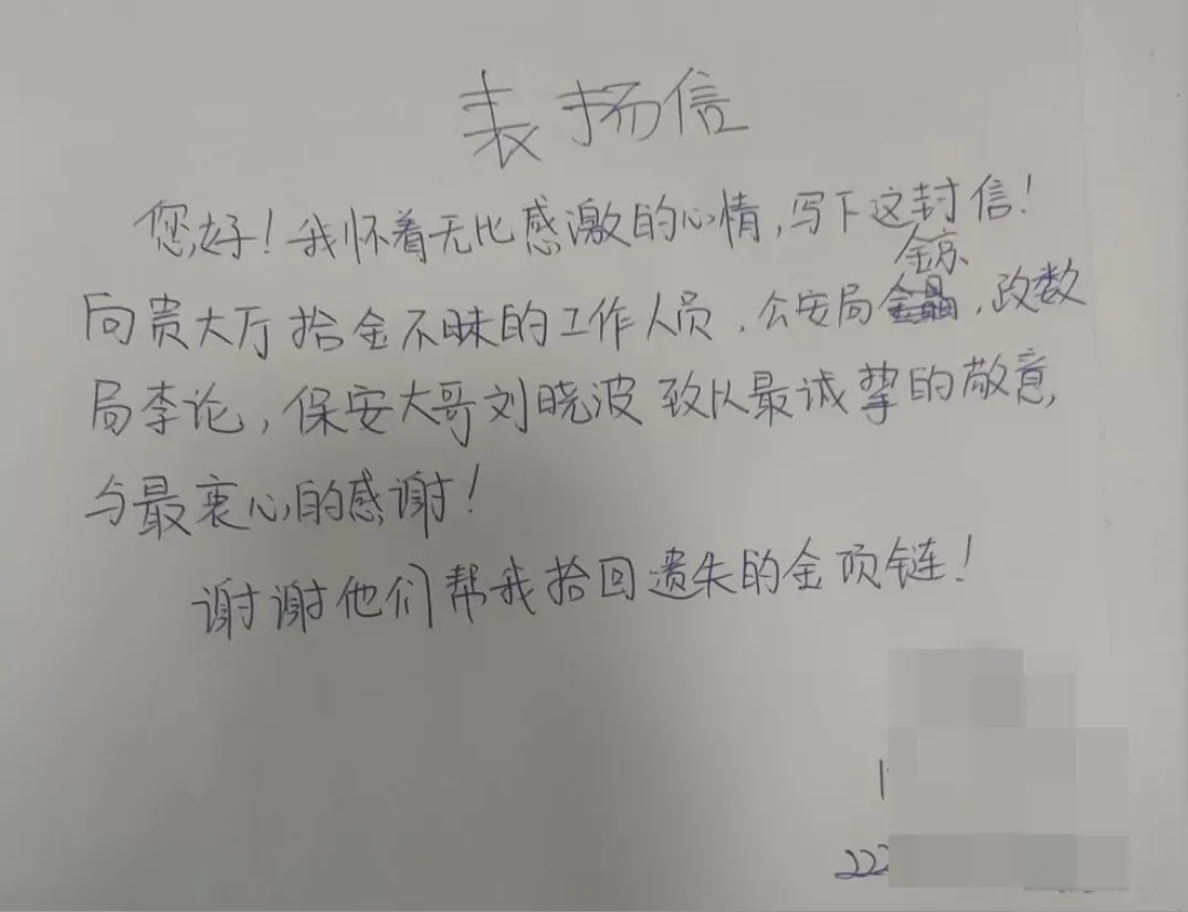 找回项链的王女士十分感动,想要当面致谢拾金不昧的好心人,可保安因对方未留下姓名,无法提供相关信息。最终,在政数局工作人员的协助下,通过调取大厅监控,找到了捡到项链的政务服务大队工作人员。王女士当场手写感谢信,盛赞民警不仅办事高效,品德更是高尚。