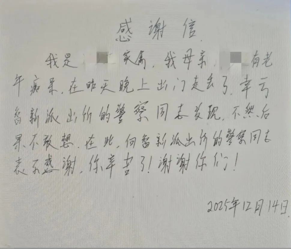 事后,老人家属特意手写一封感谢信送到智新派出所,用朴实的文字,对民辅警寒夜中快速出警、倾力救助的行为,表达最由衷的感激。