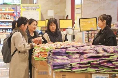走进东北亚国际商品城,浓郁的节日氛围扑面而来,印有俄文标识的紫皮糖、威化饼等休闲食品被摆放在显眼位置,成为市民、游客选购的热门年货,俄罗斯面粉、食用油等优质食材也备受消费者青睐。