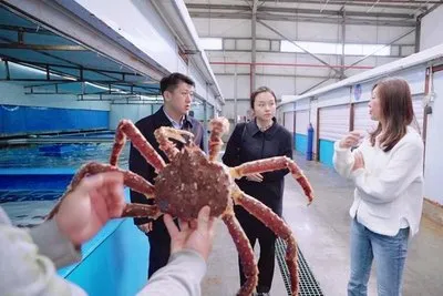 和女友一起来挑选海鲜的北京游客安洪博笑着说:“珲春的年味很特别,既有东北的热乎劲儿,也透着中俄交融的国际范儿。我们要选购一些新鲜的帝王蟹和大蟹腿,直接在店里加工,现吃现做味道最好。”