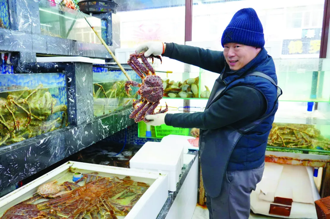 旺盛的消费需求,离不开完善的仓储暂养体系支撑。得益于政府支持和通关提速,2025年帝王蟹进口量比2024年增加了30%,一天最多能进口100吨。珲春东北亚生鲜海产园区暂养基地拥有182个暂养池,静态储存量可达500吨,目前已有百吨存货,全力保障春节市场供应。