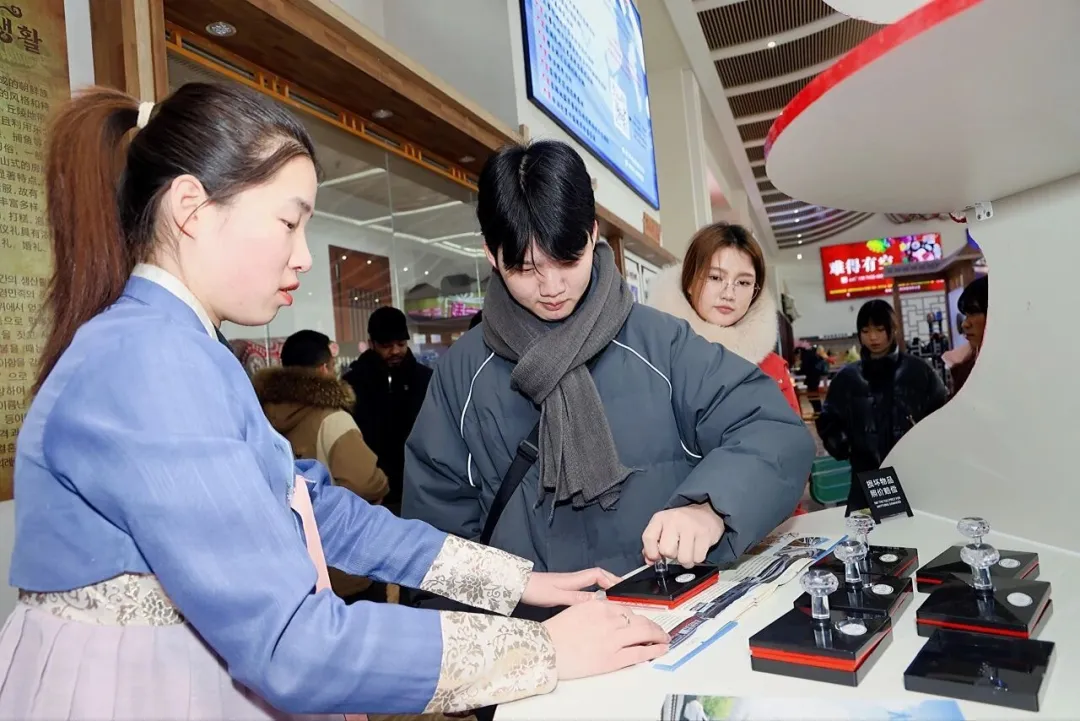候车大厅内,浓郁的朝鲜族民俗文化气息扑面而来。两幅巨型民俗壁画生动再现了农耕、节庆、歌舞等场景,搭配特色民俗微景观展柜,处处彰显着独特的延边魅力。工作人员一路讲解,让留学生们在等候间隙,沉浸式感受民族文化之美。