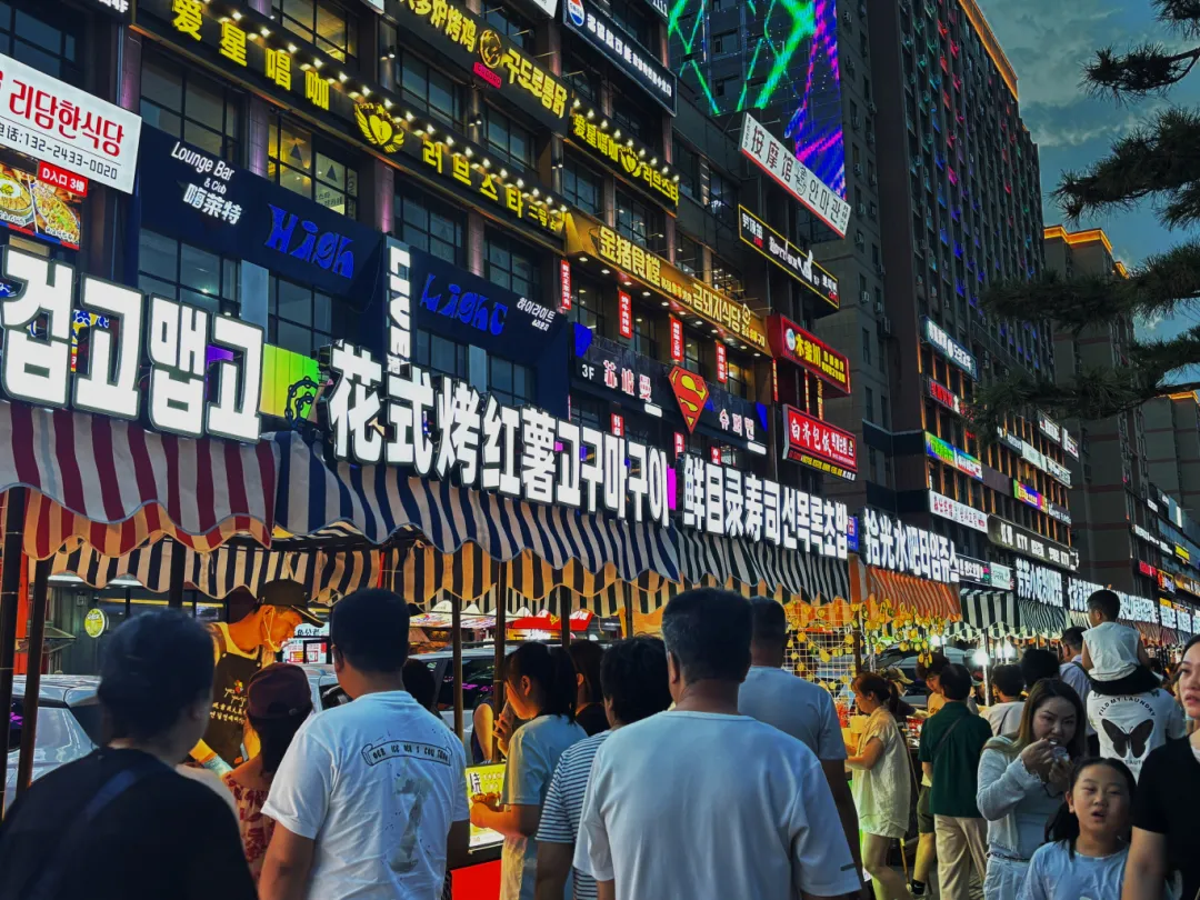 夜幕降临,延大对面的延吉网红弹幕墙亮起霓虹,红、紫、蓝各色灯光交织,双语招牌流光溢彩;夜市里烧烤香气弥漫,整座城市的夜晚被点燃,热闹又治愈。