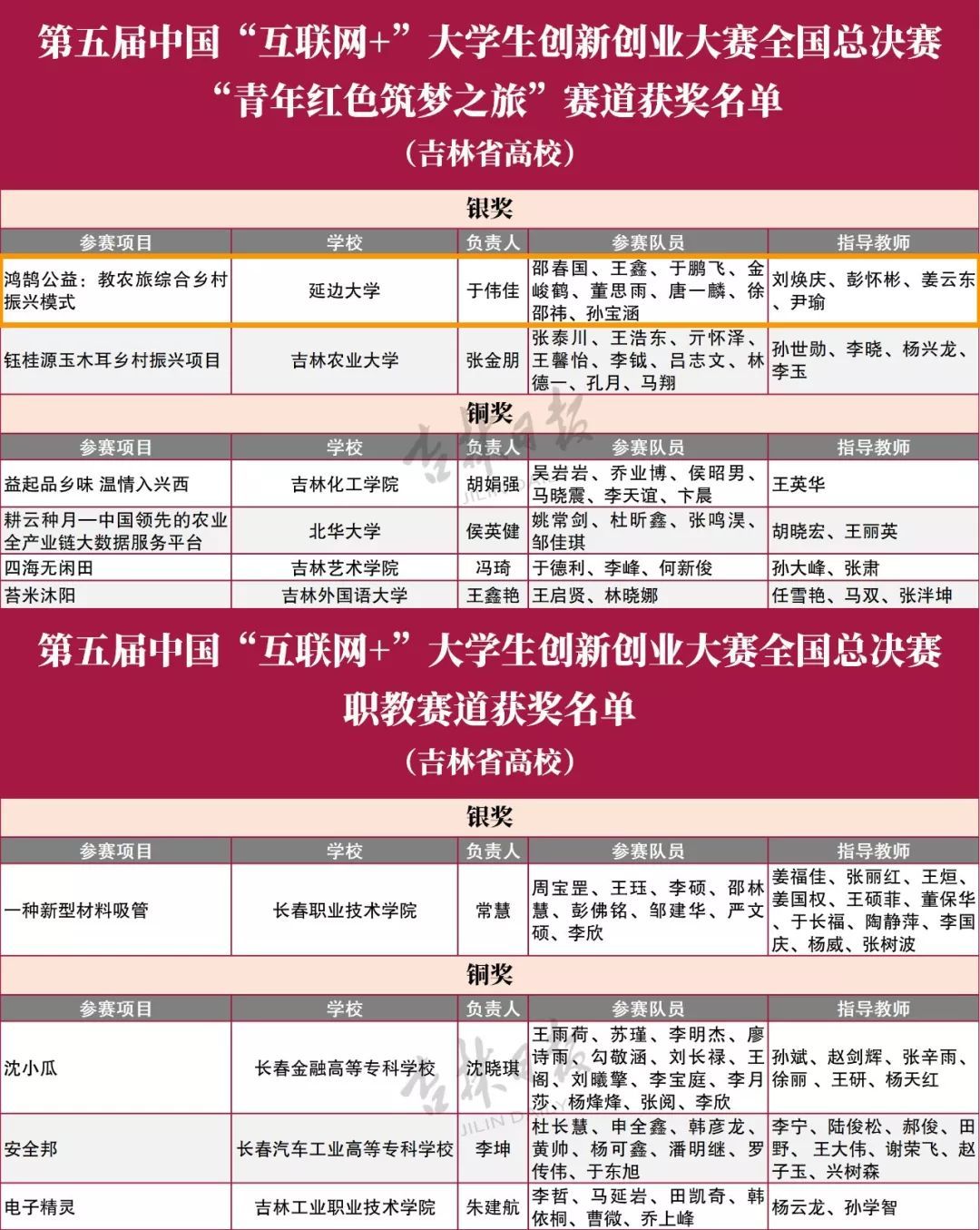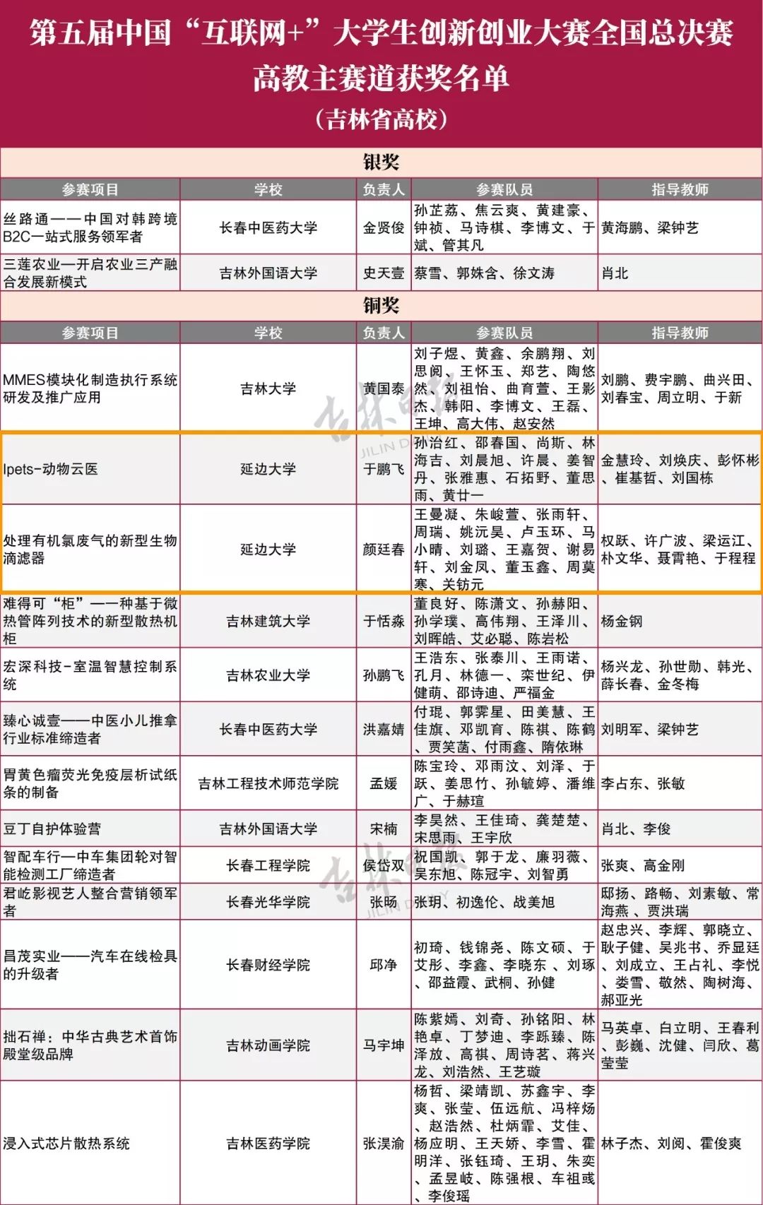 近日,教育部公布第五届中国“互联网+”大学生创新创业大赛获奖名单。吉林省22所学校取得佳绩!为他们点赞!
