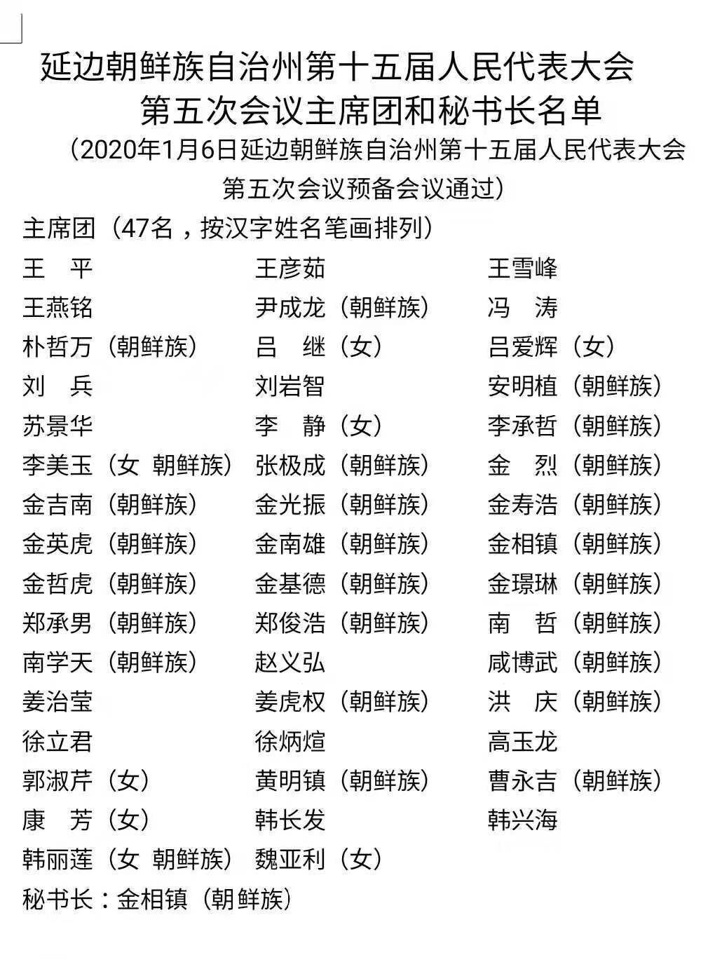 延边州第十五届人民代表大会第五次会议主席团和秘书长名单