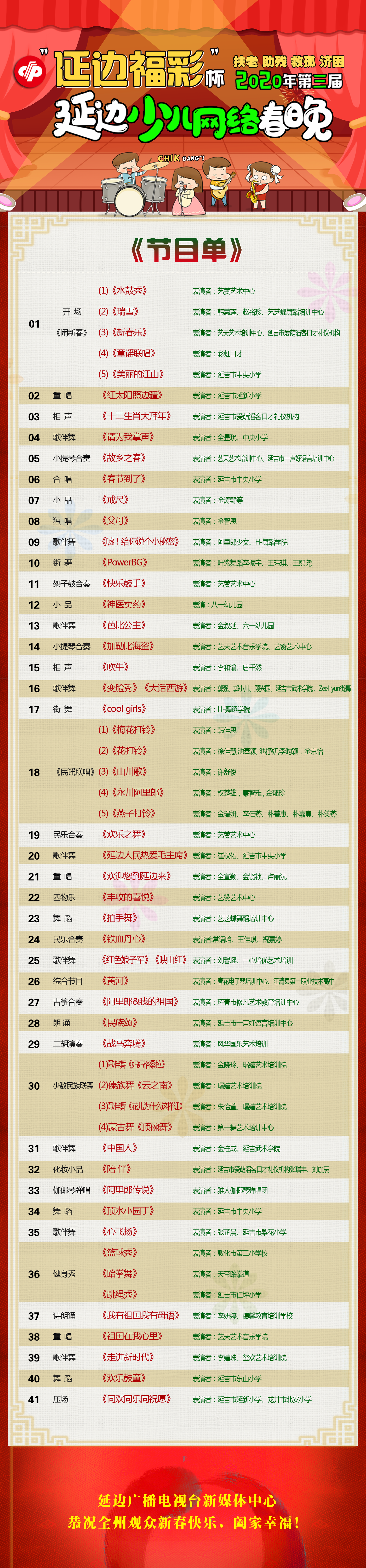 这是延边广播电视台连续第三年举办延边少儿网络春晚,作为延边少儿晚会的最高舞台,今年海选出来的节目无论从节目数量还是节目质量来说,都更胜往年!今年的晚会中近千名小演员载歌载舞,在一片欢乐祥和的氛围中,拉开了喜迎新春的序幕!