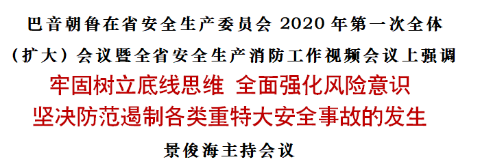 今天,省安全生产委员会召开2020年第一次全体(扩大)会议暨全省安全生产消防工作视频会议,深入学习贯彻习近平总书记关于安全生产工作重要论述精神,分析总结2019年工作,安排部署今年重点任务。省委书记巴音朝鲁在会上强调,要牢固树立底线思维,全面强化风险意识,坚决扛起“促一方发展、保一方平安”的重大政治责任,推动安全生产形势持续稳定好转,坚决防范遏制各类重特大安全事故的发生,为夺取疫情防控全面胜利、决胜全面小康营造安全稳定的社会环境。省委副书记、省长景俊海主持会议。