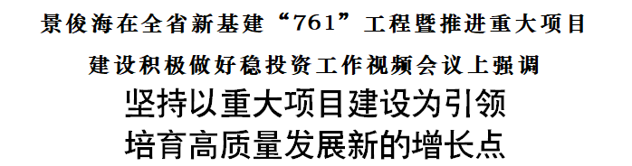 景俊海强调,抓新基建、上项目、稳投资,是夺取疫情防控和经济社会发展双胜利的关键举措。一要强共识、抓机遇,锲而不舍突出新基建“761”工程重要地位。科学布局重大项目,接续滚动梯次投资,抓增量、扩规模、上层次,加强与民间投资对接,加快形成新动能。二要强举措、抓突破,锲而不舍发挥重大项目建设带动作用。对标“七新”“六网”“补短板”,加快5G基础设施、工业互联网等项目落地,引领产业转型升级方向,补齐民生保障、公共卫生、应急管理等短板,更好满足人民对美好生活的向往。抢抓政策机遇窗口期,聚焦“十个围绕”,突出与“一主、六双”产业空间布局配套衔接,加快项目谋划实施,争取更多项目进入国家“大盘子”。拓宽招商引资思路,全面加强新基建等重点领域对接合作。三要强保障、抓要素,锲而不舍推动项目建设落地落位。持续深化“放管服”和“最多跑一次”改革,用好专项债券,强化金融支持,完善要素保障,优化审批服务,促进项目及时开工建设、尽快达产见效。四要强统筹、抓落实,锲而不舍确保项目建设顺利实施。加强组织领导,完善工作机制,创新方式方法,为项目建设创造良好条件。