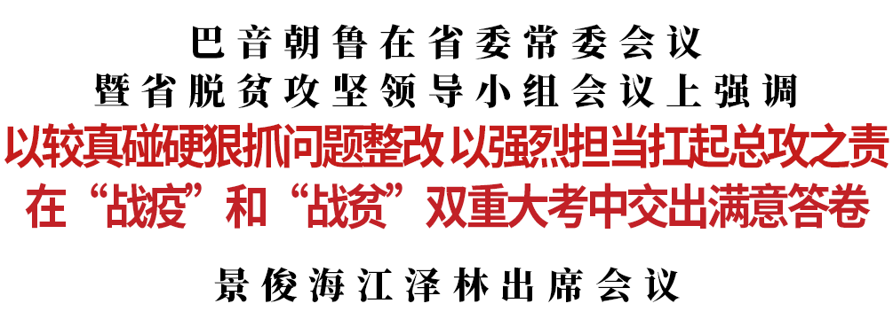 巴音朝鲁指出,脱贫攻坚是习近平总书记最关心、最牵挂、倾注心血最多的头等大事。最近,习近平总书记发表了一系列重要讲话,释放了决战决胜脱贫攻坚,时间紧迫、不能停顿,任务艰巨、不能大意,千钧重担、不能放松,务必全胜、不容有失的四个强烈信号。各级党委、政府和有关部门一定要把思想和行动统一到习近平总书记重要讲话精神上来,以较真碰硬狠抓问题整改,以强烈担当扛起总攻之责,确保收官之年各项目标任务如期完成,在“战疫”和“战贫”的双重大考中践行初心使命、交出满意答卷。