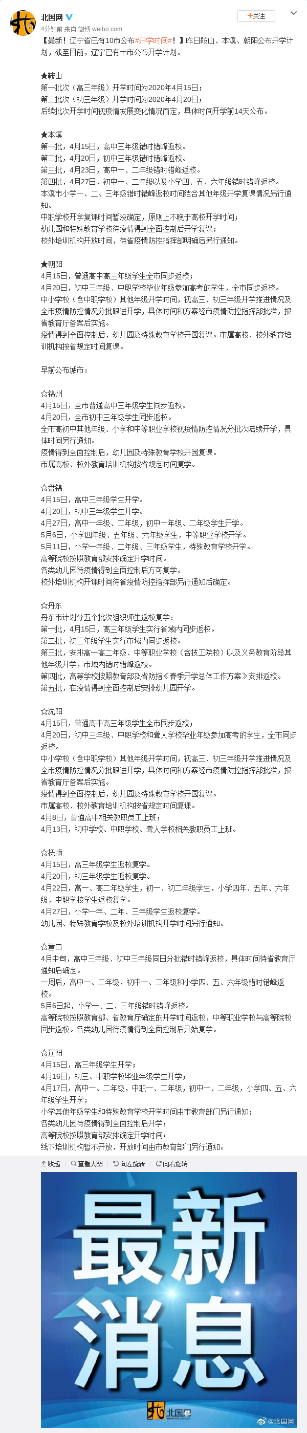昨日鞍山、本溪、朝阳公布开学计划,截至目前,辽宁已有十市公布开学计划。