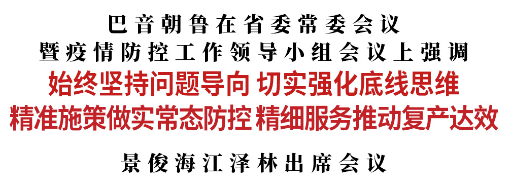 今天(4月10日),省委书记、省疫情防控工作领导小组组长巴音朝鲁主持召开省委常委会议暨疫情防控工作领导小组会议,传达学习习近平总书记在中央政治局常委会会议上的重要讲话精神,听取当前我省疫情防控重点工作情况,安排部署下步工作。他强调,要深入贯彻落实习近平总书记重要讲话精神,准确把握我省疫情防控和经济运行形势,始终坚持问题导向,切实强化底线思维,精准施策做实常态防控,精细服务推动复产达效。省长、领导小组组长景俊海,省政协主席江泽林出席会议。