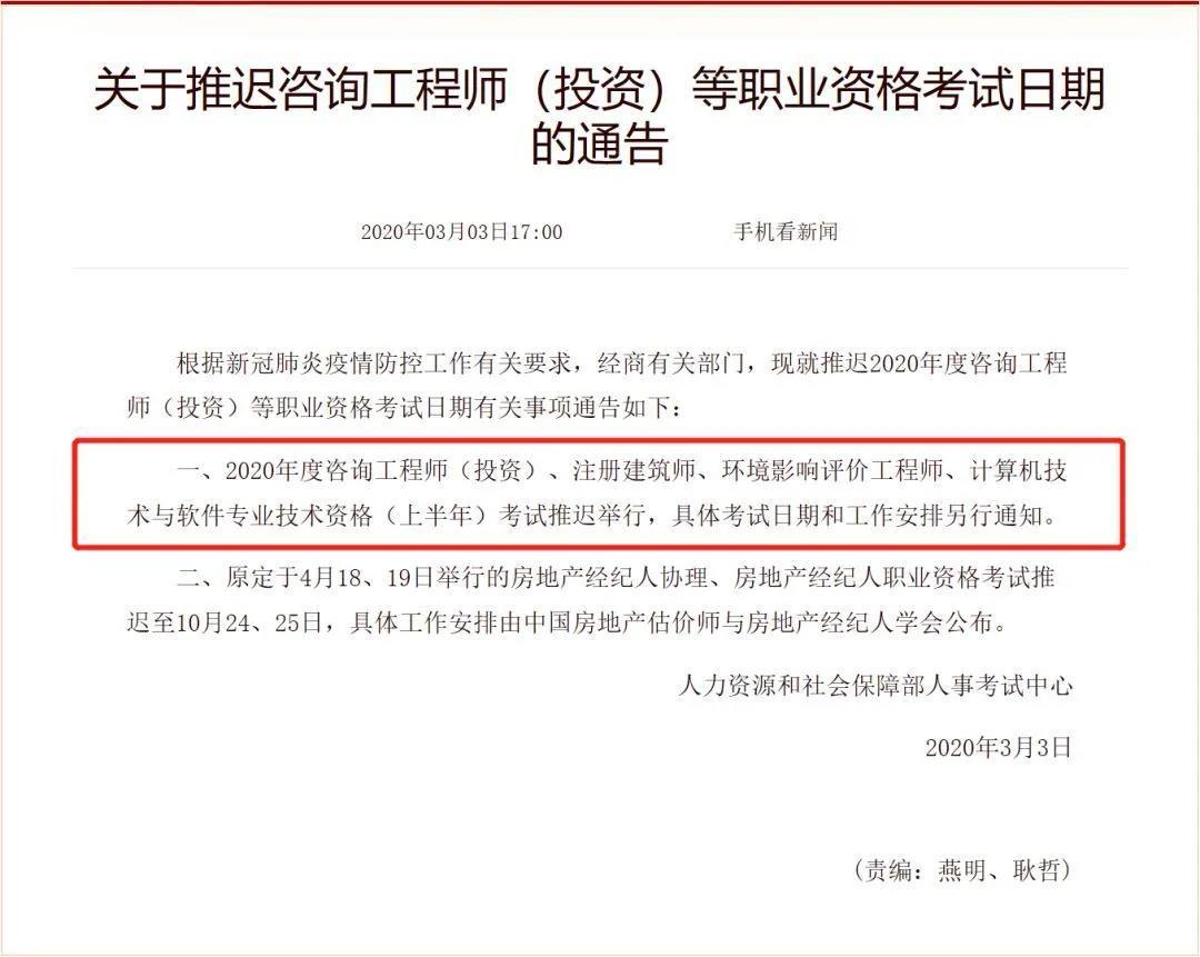 咨询工程师(投资)、注册建筑师、环境影响评价工程师、计算机技术与软件专业技术资格(上半年)考试推迟