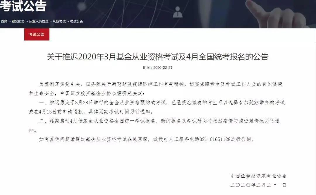 二、延期启动4月份基金从业资格全国统一考试报名,新的报名及考试时间将根据疫情防控进展情况另行通知。