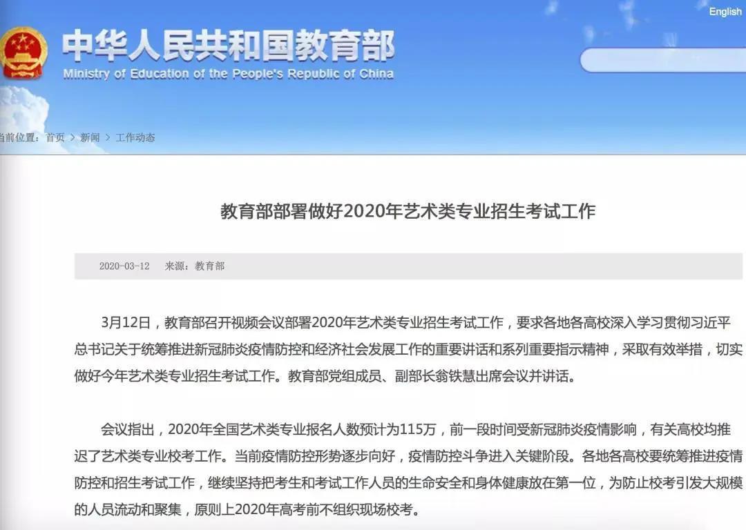 3月12日,教育部召开视频会议部署2020年艺术类专业招生考试工作。会议指出,2020年全国艺术类专业报名人数预计为115万,前一段时间受疫情影响,有关高校均推迟了艺术类专业校考工作。为防止校考引发大规模的人员流动和聚集,原则上2020年高考前不组织现场校考。