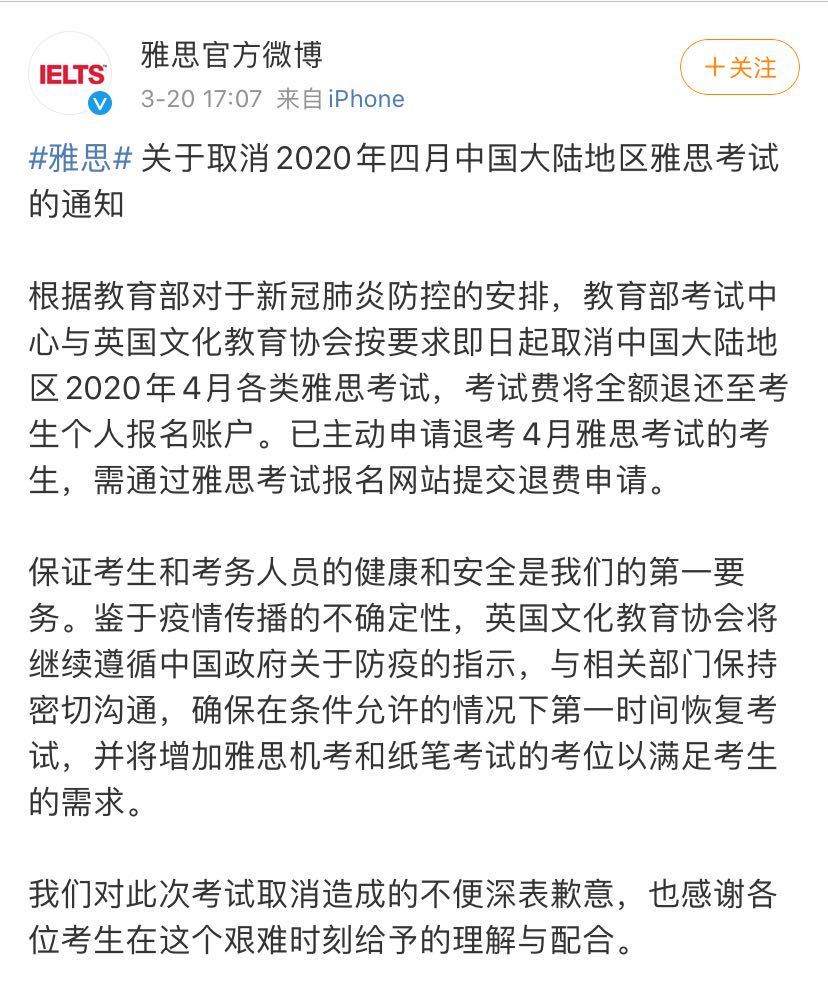 根据教育部对于新冠肺炎防控的安排,教育部考试中心与英国文化教育协会按要求即日起取消中国大陆地区2020年4月各类雅思考试,考试费将全额退还至考生个人报名账户。已主动申请退考4月雅思考试的考生,需通过雅思考试报名网站提交退费申请。
