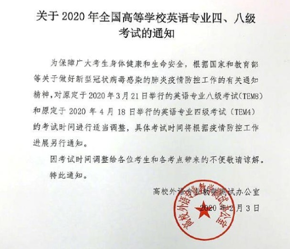 原定于3月21日举行的英语专业八级考试和原定于4月18日举行的英语专业四级考试的考试时间将进行适当调整,具体考试时间将根据疫情防控工作进展另行通知。