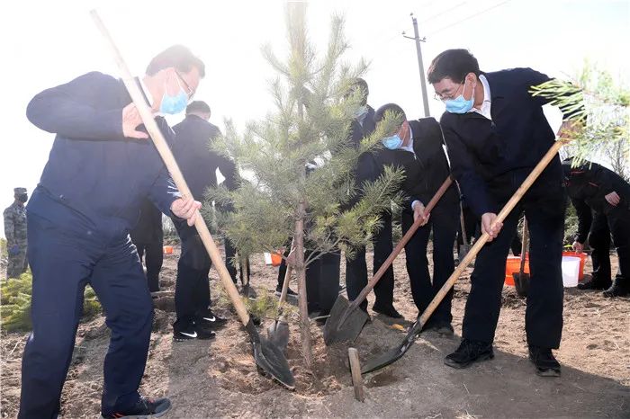 4月13日,巴音朝鲁、景俊海在松原市查干湖参加义务植树活动