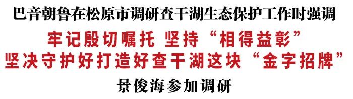 调研中,巴音朝鲁指出,查干湖是吉林西部生态经济区的核心区,是我省重要的生态屏障。各级党委、政府和有关部门要认真贯彻习近平总书记重要指示精神,坚持保护生态和发展生态旅游相得益彰,像珍惜和爱护眼睛一样呵护查干湖这一方圣水,做到保护与发展并重、生态与旅游并举,坚决守护好查干湖这块“金字招牌”,把查干湖打造成我省生态优先、绿色发展的先行区、示范区。要抓紧修订《查干湖生态保护规划》,加快编制相关专项规划,促进“多规合一”,形成“一张蓝图”。要积极推进重点生态治理保护工程,多方筹措资金,加快建设进度,争取早日建成运营、发挥效益。要加强生态修复与污染治理,统筹推进山水林田湖草综合治理,坚持远近结合、水岸同治,突出抓好绿化造林、湿地补水、排污管控、农村人居环境整治等工作,推动查干湖生态环境持续向好。要大力发展生态旅游,开发特色旅游产品,完善配套基础设施,努力把查干湖旅游品牌做大做强做响。要切实抓好环保督察整改,进一步加大推进力度,确保按时保质完成。