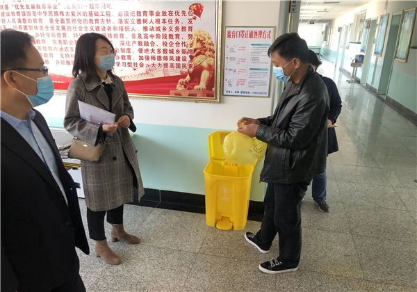 在依兰镇烟集学校卫健部门检查人员示范医用废弃垃圾袋处理方式