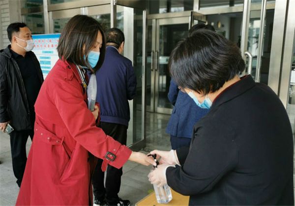 在朝阳川第一中学教学楼门口用免洗液洗手后入校