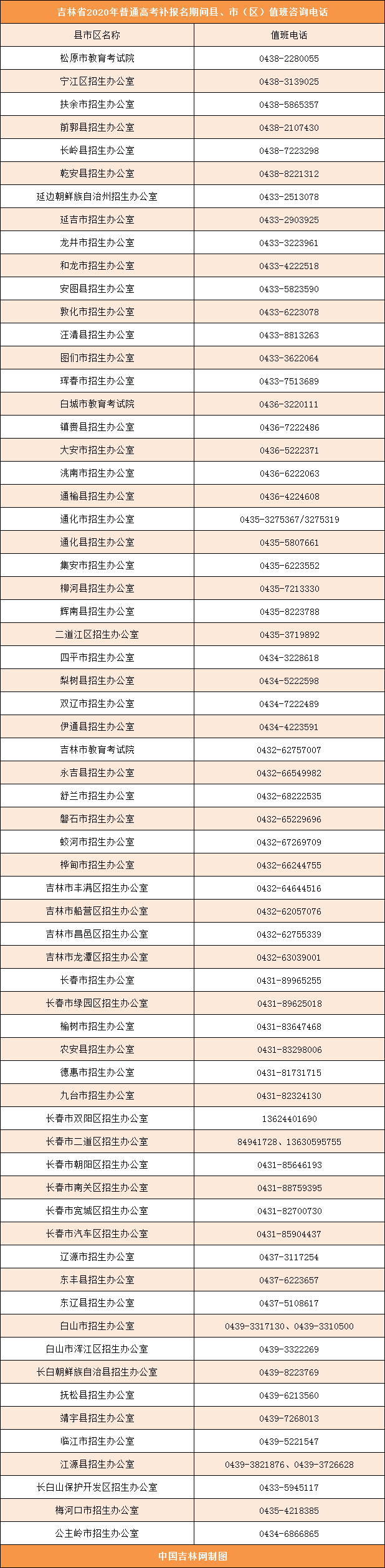 吉林省2020年普通高考补报名期间县、市(区)值班咨询电话: