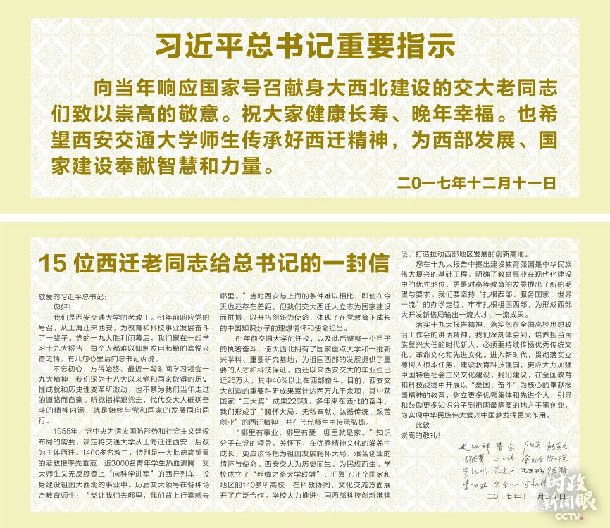 当年给总书记写信的15位西迁老教授已有一人辞世。22日下午,习近平亲切会见了健在的14位西迁老教授。总书记说,从黄浦江畔搬到渭水之滨,你们打起背包就出发,舍小家顾大家。交大西迁对整个国家和民族来讲、对西部发展战略布局来讲,意义都十分重大。