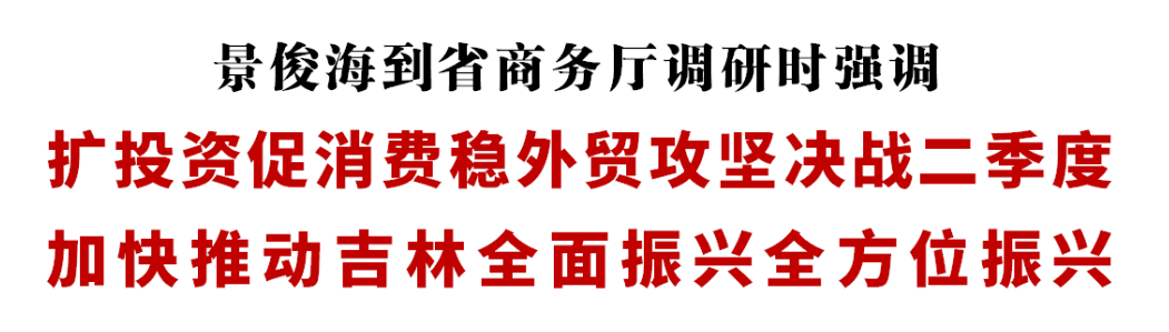 4月27日,省委副书记、省长景俊海到省商务厅调研。他强调,要深入贯彻习近平总书记重要讲话和重要指示批示精神,落实省委、省政府工作安排,主动融入共建“一带一路”大格局,扬优势、补短板、激活力,扩投资、促消费、稳外贸,全力促进商务工作高质量发展,为攻坚决战二季度、实现全年既定目标提供坚强保障,加快推动吉林全面振兴全方位振兴。
