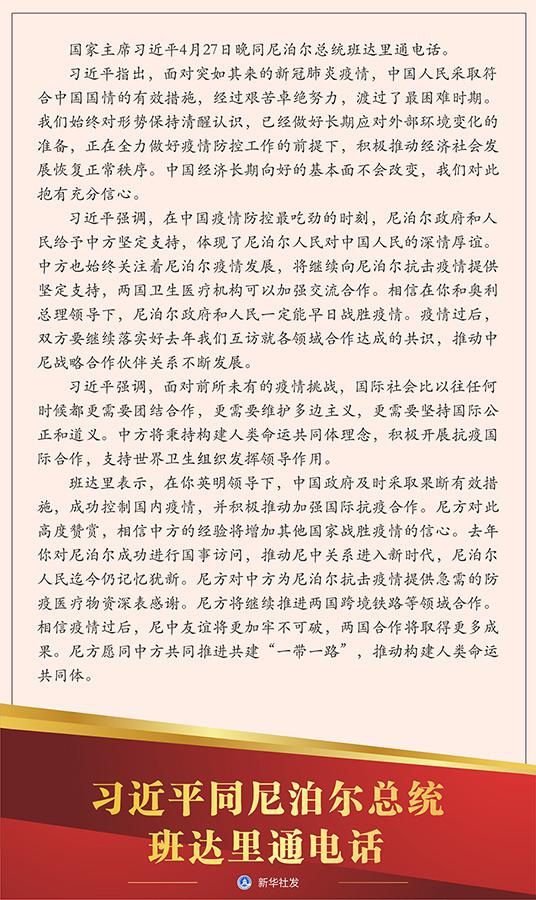 习近平强调,在中国疫情防控最吃劲的时刻,尼泊尔政府和人民给予中方坚定支持,体现了尼泊尔人民对中国人民的深情厚谊。中方也始终关注着尼泊尔疫情发展,将继续向尼泊尔抗击疫情提供坚定支持,两国卫生医疗机构可以加强交流合作。相信在你和奥利总理领导下,尼泊尔政府和人民一定能早日战胜疫情。疫情过后,双方要继续落实好去年我们互访就各领域合作达成的共识,推动中尼战略合作伙伴关系不断发展。