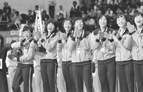 1981年11月16日,中国女排在第三届女排世界杯颁奖仪式上(图片来源:新华社)