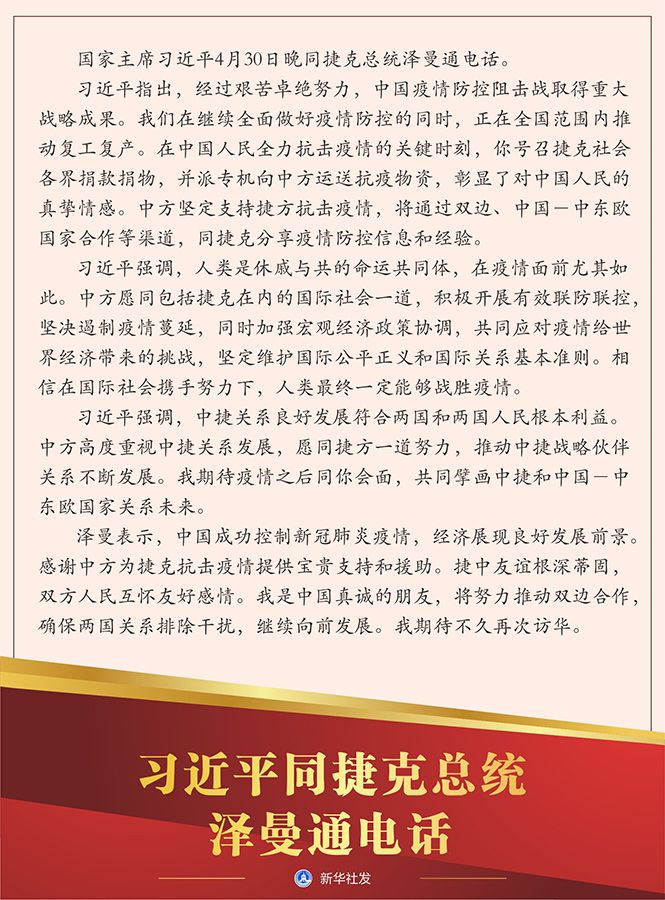 习近平指出,经过艰苦卓绝努力,中国疫情防控阻击战取得重大战略成果。我们在继续全面做好疫情防控的同时,正在全国范围内推动复工复产。在中国人民全力抗击疫情的关键时刻,你号召捷克社会各界捐款捐物,并派专机向中方运送抗疫物资,彰显了对中国人民的真挚情感。中方坚定支持捷方抗击疫情,将通过双边、中国-中东欧国家合作等渠道,同捷克分享疫情防控信息和经验。