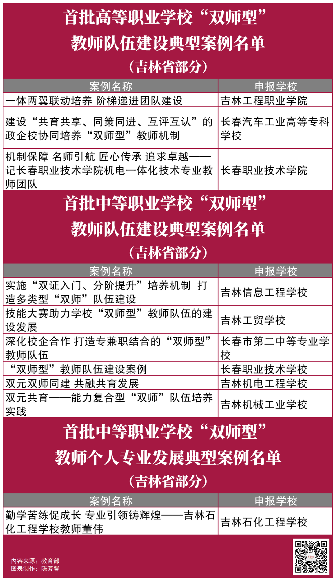 近日,教育部教师工作司最新公布全国职业院校“双师型”教师队伍建设典型案例。吉林工程职业学院、长春汽车工业高等专科学校、长春职业技术学院、吉林信息工程学校、吉林工贸学校、长春市第二中等专业学校、长春职业技术学校、吉林机电工程学校、吉林机械工业学校、吉林石化工程学校榜上有名!