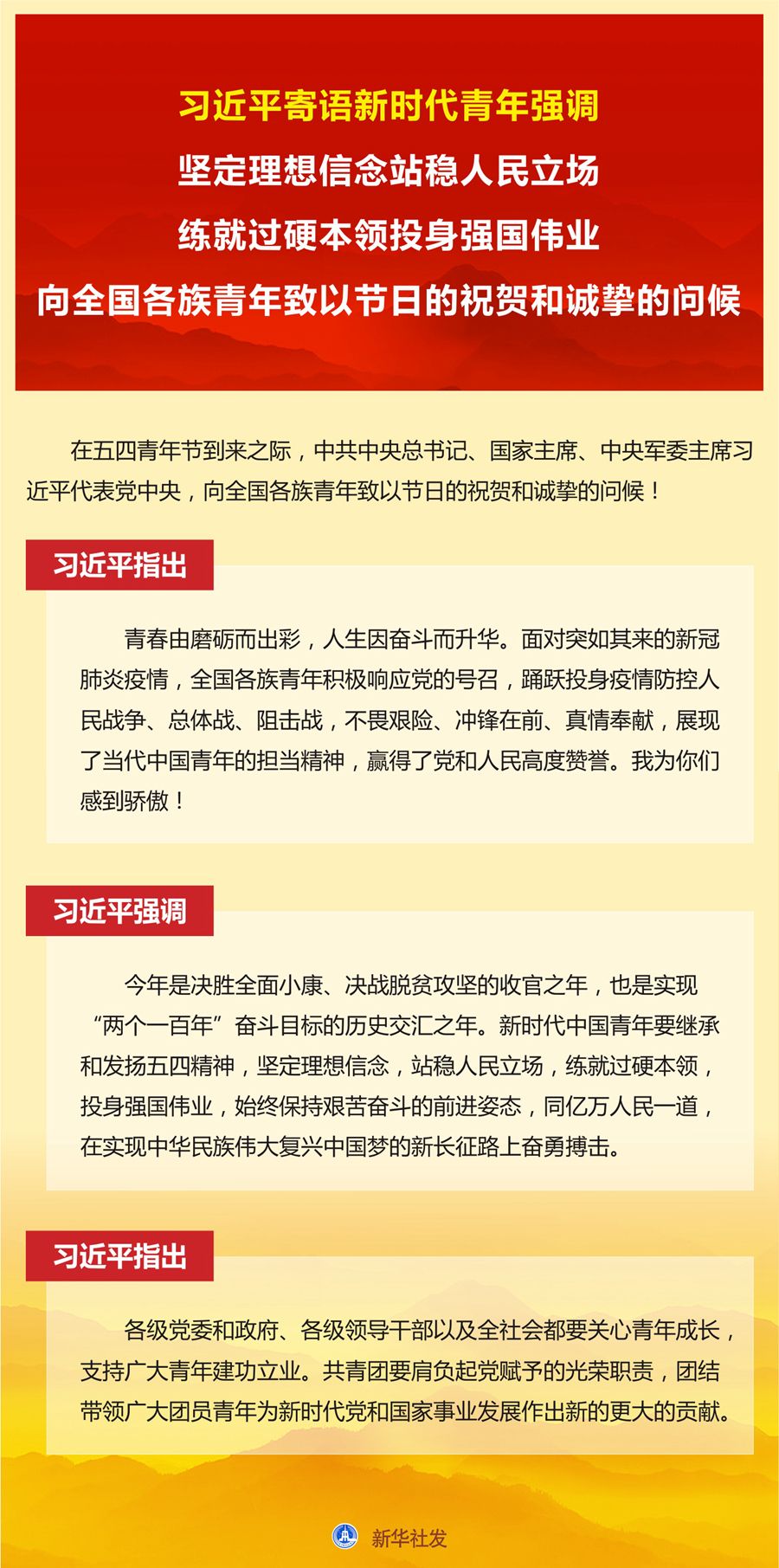 习近平寄语新时代青年强调坚定理想信念站稳人民立场 练就过硬本领投身强国伟业 向全国各族青年致以节日的祝贺和诚挚的问候