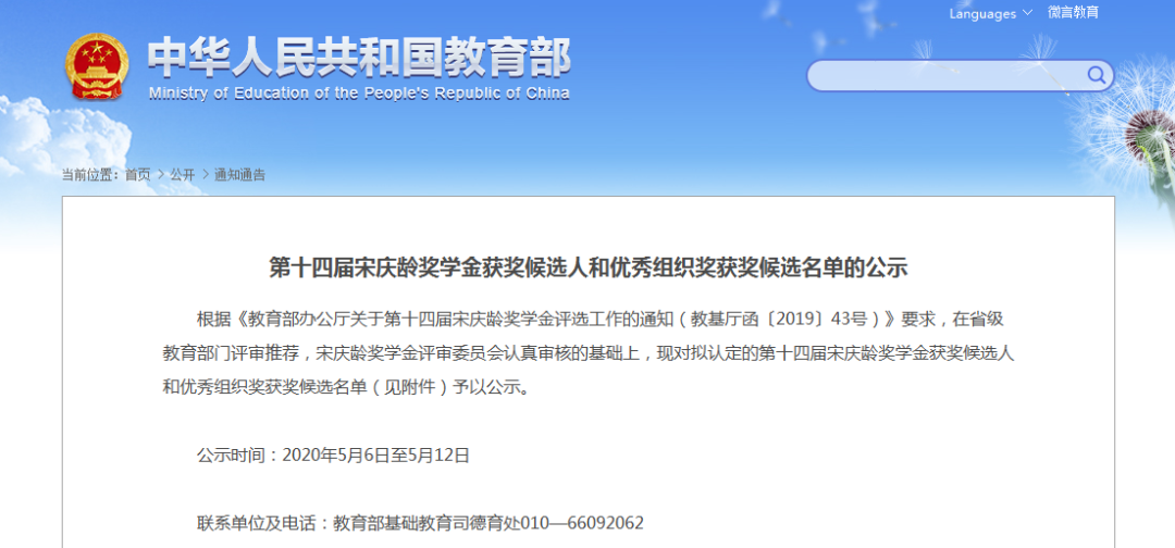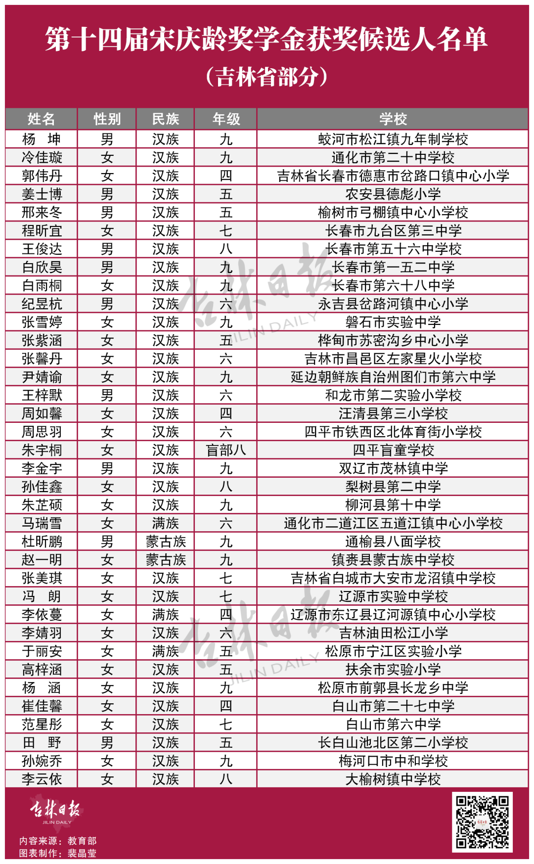 5月6日,教育部公示《第十四届宋庆龄奖学金获奖候选人和优秀组织奖获奖候选名单》。吉林省共36人入选第十四届宋庆龄奖学金获奖候选人名单,吉林省教育厅基础教育处入选第十四届宋庆龄奖学金工作优秀组织奖候选名单。