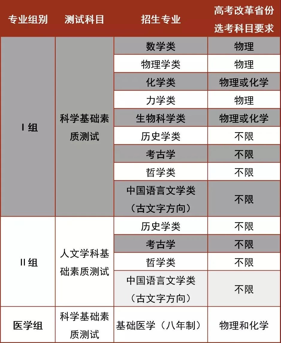 (1)学科基础素质测试:传统高考省份:Ⅰ组和医学组测试内容为数学、物理、化学,Ⅱ组测试内容为语文、历史、政治;高考综合改革省份:Ⅰ组和医学组测试内容为数学、物理,Ⅱ组测试内容为语文、历史。