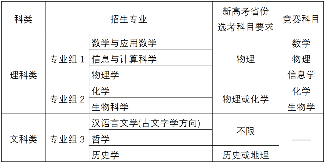 注:表中所列专业在非高考综合改革省份仅招收理科生源,高考综合改革省份选考科目要求均为“物理”。具体分省计划将于强基计划报名系统中公布。