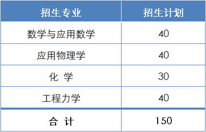 数学与应用数学、信息与计算科学、应用物理学、化学、工程力学5个专业共计划招生150人。