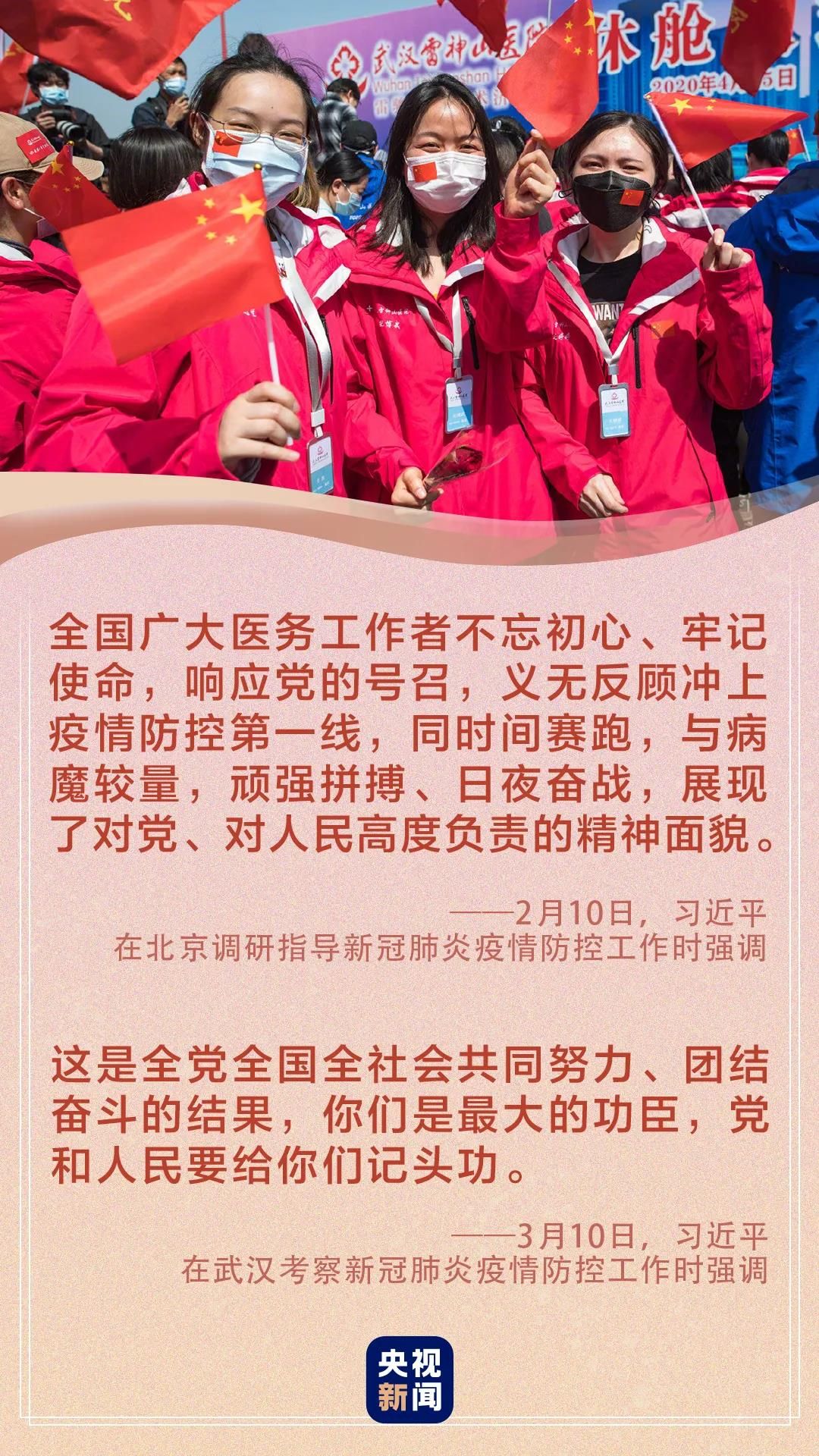 习近平指出,在湖北和武汉人民遭受疫情打击的关键关头,广大医务工作者坚韧不拔、顽强拼搏、无私奉献,展现了医者仁心的崇高精神,展现了新时代医务工作者的良好形象,感动了中国,感动了世界。