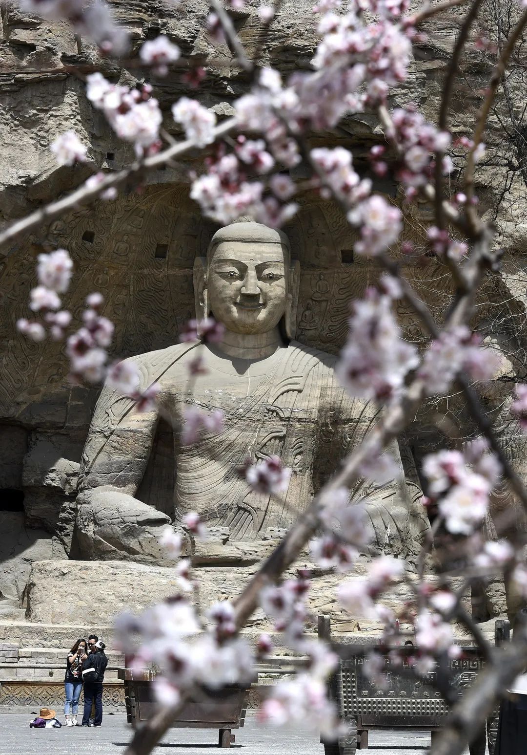 游客在云冈石窟景区参观(新华社记者燕雁 摄)