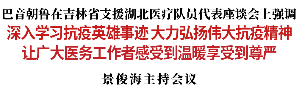 在认真听取大家发言后,巴音朝鲁满含深情地说,这次疫情是新中国成立以来发生的传播速度最快、感染范围最广、防控难度最大的一次重大突发公共卫生事件。在疫情防控最紧急、最关键、最危险的时候,我省1209名白衣战士听从习近平总书记号令,逆行出征、开赴武汉,同全国各地支援武汉医疗队一道保卫武汉、保卫湖北。与此同时,在家乡疫情防控第一线,广大医务工作者闻令而动、向险而行,义无反顾、日夜奋战在重症救治、流调排查最前沿,与死神零距离交锋,与病毒面对面肉搏,为夺取疫情防控阶段性重大胜利作出了突出贡献。在这场斗争中,吉林广大医务工作者用实际行动书写了对党和人民的无限忠诚,诠释了伟大抗疫精神,不愧是抗击疫情的中坚力量,不愧是新时代最可爱的人,不愧是吉林人民的优秀儿女,人民、时代、历史都不会忘记你们。