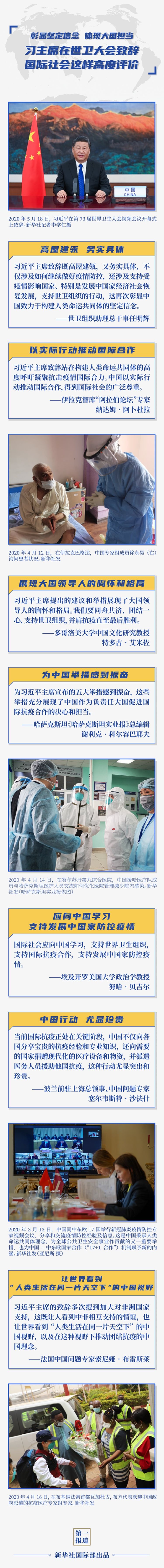 5月18日晚,习近平主席在第73届世界卫生大会视频会议开幕式上发表题为《团结合作战胜疫情共同构建人类卫生健康共同体》的致辞。习主席在致辞中提出加强疫情防控六项建议以及中国为推进全球抗疫合作五大举措,彰显了中国致力于构建人类命运共同体的坚定信念,体现了中国积极推动全球抗疫合作的大国担当,得到国际社会积极呼应和高度评价。