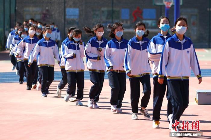 资料图:5月11日,北京丰台二中初三学生到操场准备进行升旗仪式。当日,北京市初三年级学生返校复课。 中新社记者 富田 摄