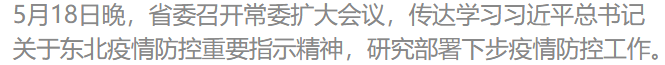 5月18日晚,省委书记巴音朝鲁主持召开省委常委扩大会议,传达学习习近平总书记关于东北疫情防控重要指示精神,听取当前疫情防控情况汇报,研究部署下步疫情防控工作。他强调,要坚决贯彻习近平总书记重要指示精神,抓紧抓实抓细疫情防控措施,补齐工作短板,压实防控责任,严防疫情反弹。省委副书记、省长景俊海,省政协主席江泽林出席会议。