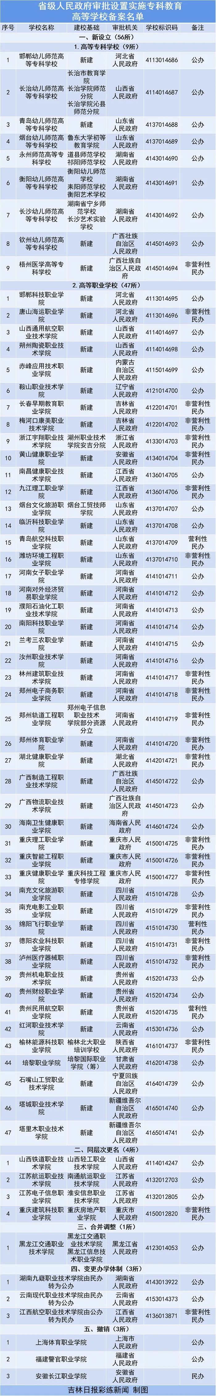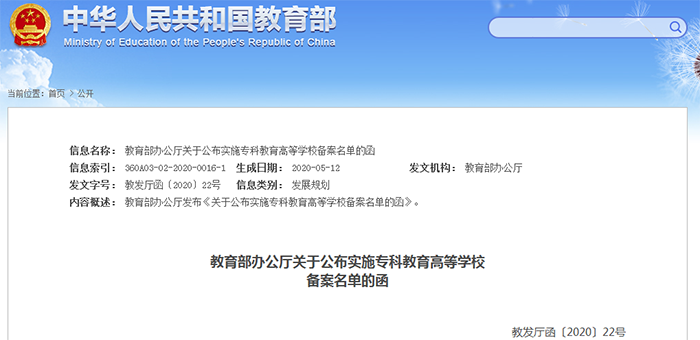 5月21日,教育部官网公布《教育部办公厅关于公布实施专科教育高等学校备案名单的函》:根据《中华人民共和国高等教育法》《普通高等学校设置暂行条例》等有关法律法规的规定,教育部办公厅公布本年度省级人民政府审批新设、更名、合并调整、变更办学体制、撤销的专科层次高等学校备案名单。