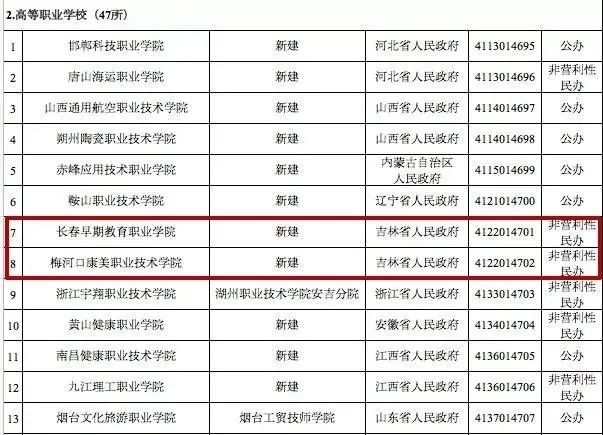 梳理教育部发布的新设立高等职业学校名单发现,吉林省新设立两所非营利性民办高校,分别为长春早期教育职业学院(学校识别码为4122014701)、梅河口康美职业技术学院(学校识别码为4122014702)。