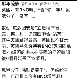 也有网友发帖表示:“乱港分子感动的哭了,但纷纷表示,自己根本没有BNO护照啊!”